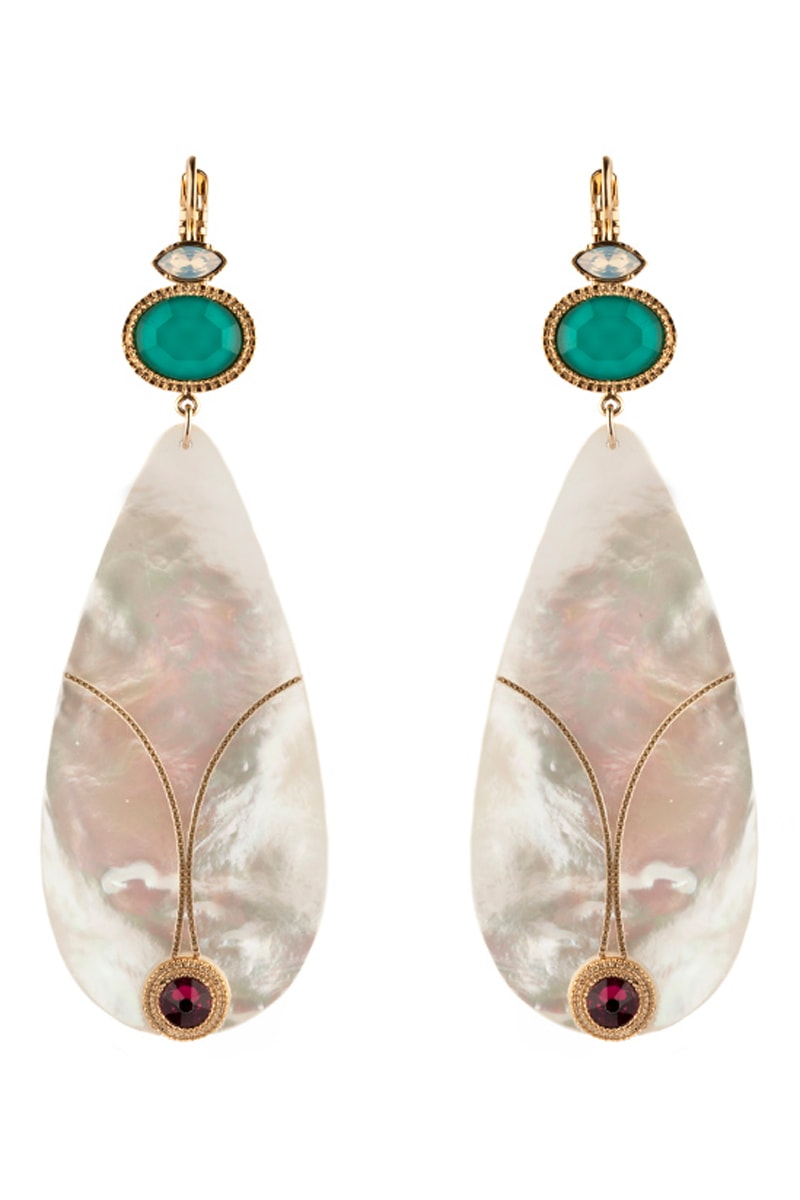 Boucles d’oreilles pendantes dorées à l'or fin jaune serties de nacre, de cristaux et ornées de cristaux de Swarovski®.