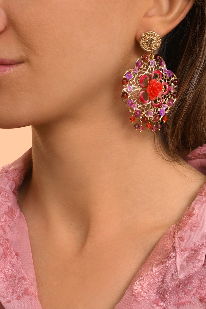 Boucles d'oreilles pendantes serties de nacre, perles d’imitation et cristaux.