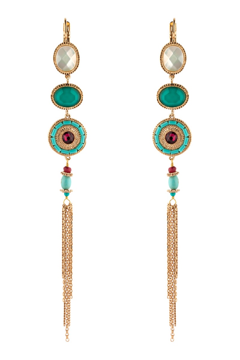 Boucles d’oreilles pendantes dorées à l'or fin jaune serties de nacre, d’un jade, d’une turquoise, de perles japonaises, de howlites, de cristaux et ornées de cristaux de Swarovski®.