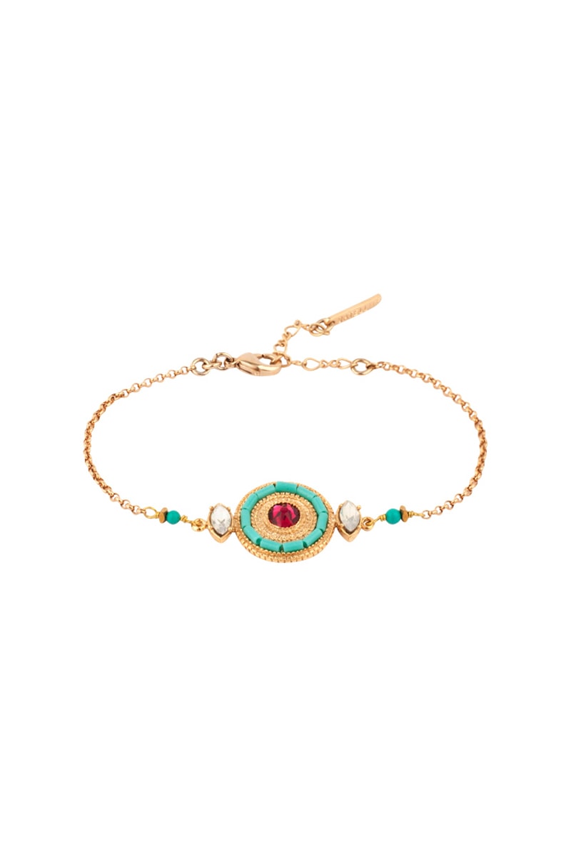 Bracelet doré à l’or fin jaune serti de nacre, de 11 perles japonaises, de 2 turquoises, de 2 hématites et orné de cristaux de Swarovski®.