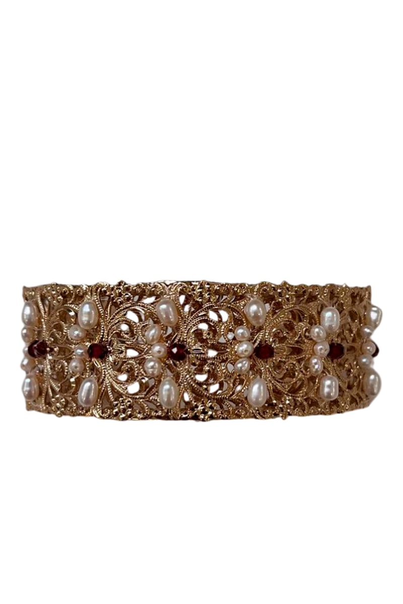 Manchette dorée à l’or fin jaune sertie de perles de culture d’eau douce et de cristaux.