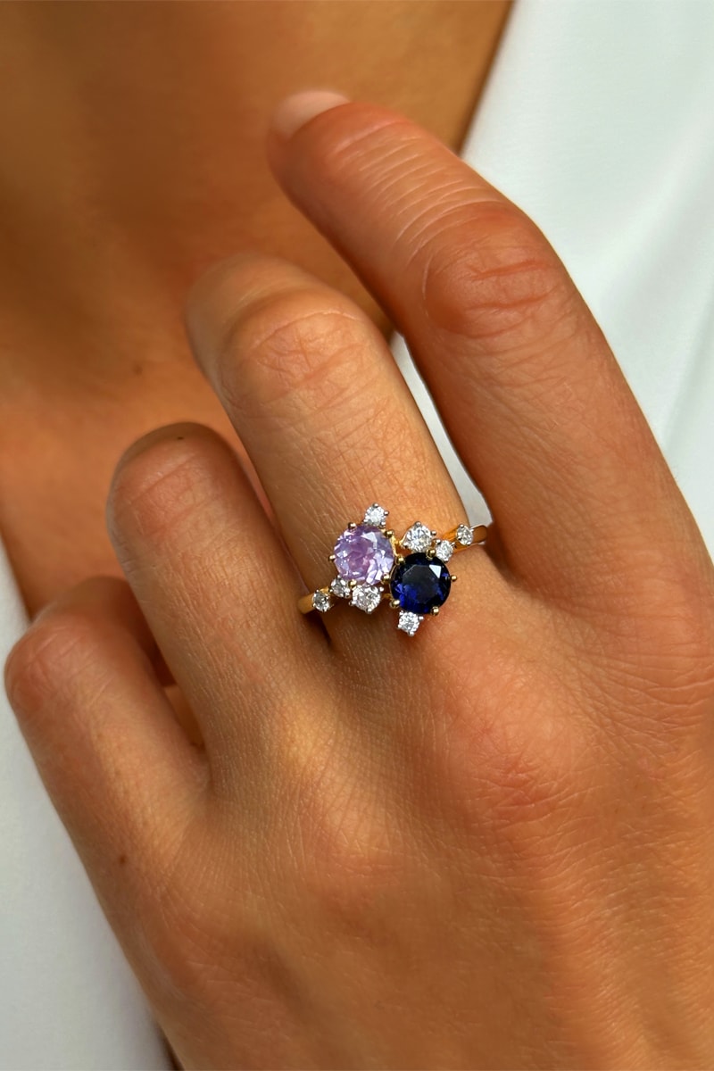 Bague en argent plaqué or jaune sertie d’une améthyste, d’une lolite et de zirconiums.