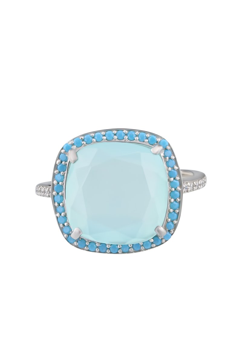Bague en argent sertie d'une aqua calci, de turquoises et de zirconiums.