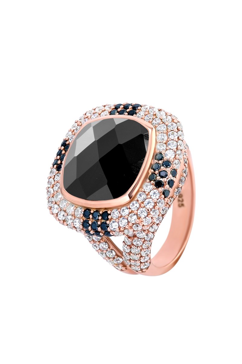 Bague en argent plaqué or rose sertie d'un onyx, de zirconiums et de spinelles.