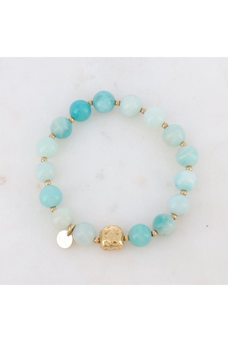 Bracelet élastique en pierres amazonites et perle dorée martelée.