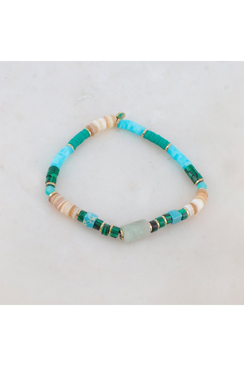 Bracelet élastique serti de malachites, d’amazonites, de coquillages et de perles heishi.