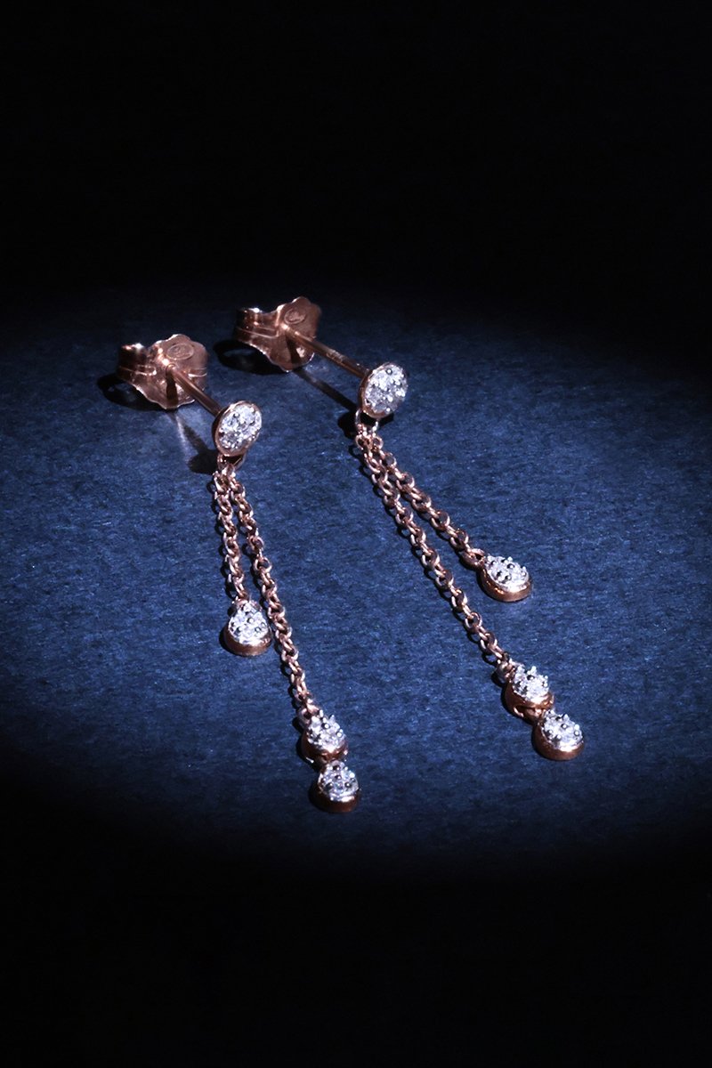 Boucles d’oreilles pendantes en or rose serties de 19 diamants.
