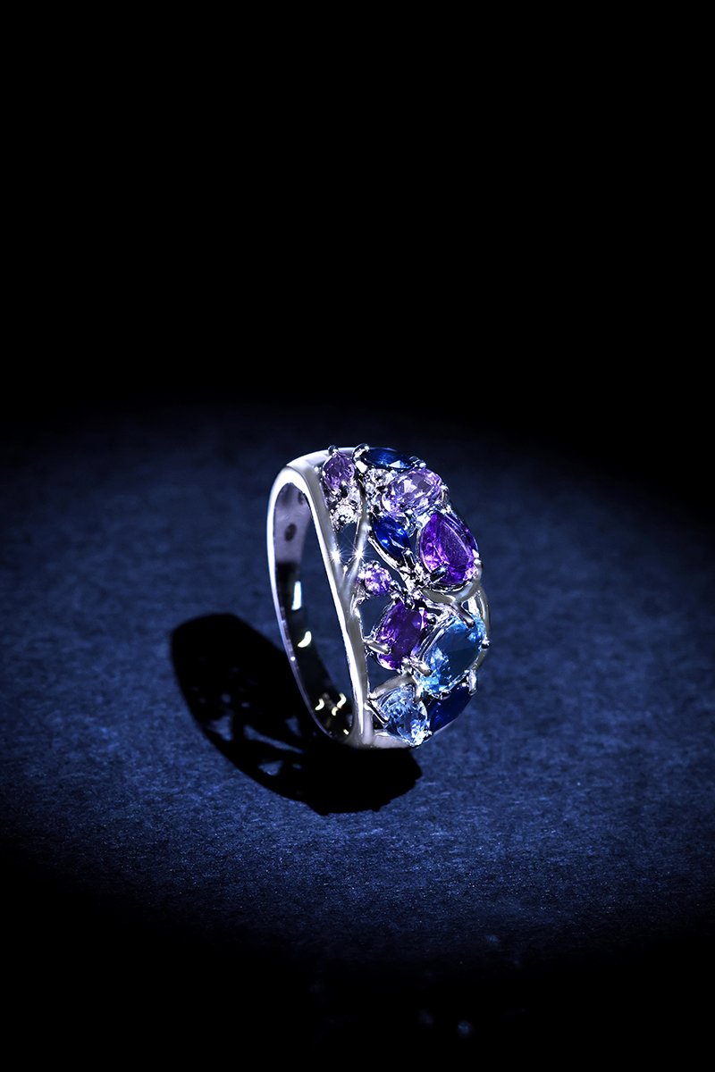Bague Champêtre - Or blanc, diamant, saphirs, topazes et améthystes