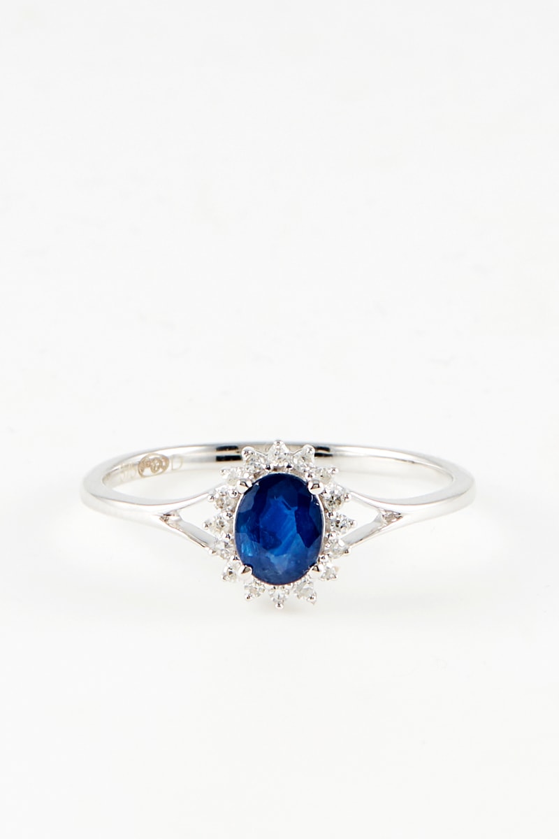 Bague en or blanc sertie d’un saphir et de 16 diamants.