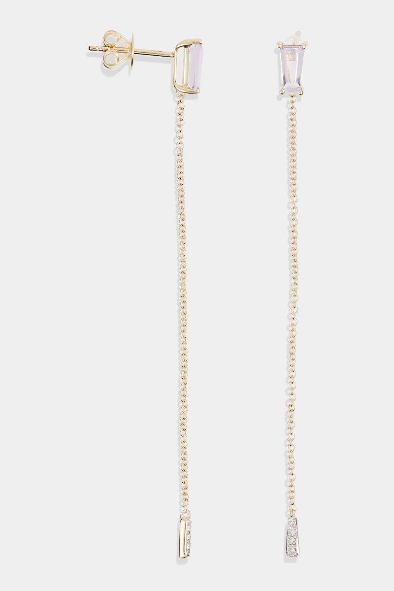 Boucles d'oreilles pendantes en or jaune serties de 4 diamants et d'une améthyste.