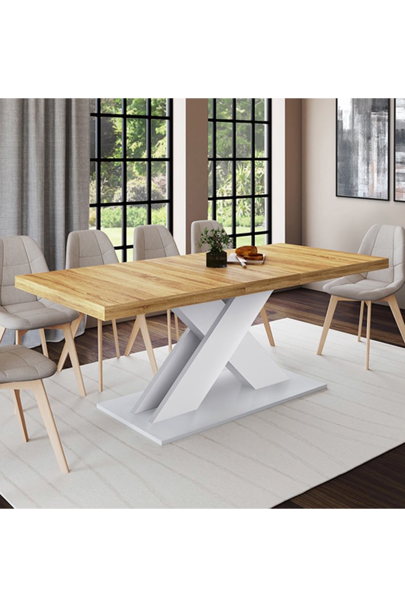 Table à manger extensible en panneaux en particules de bois mélaminé.