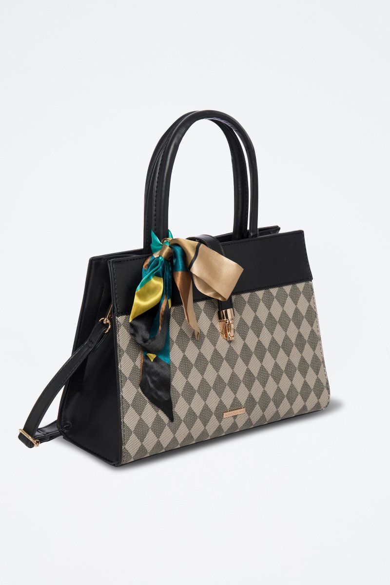 Motifs à carreaux, empiècement en métal avec logo et foulard amovible devant.