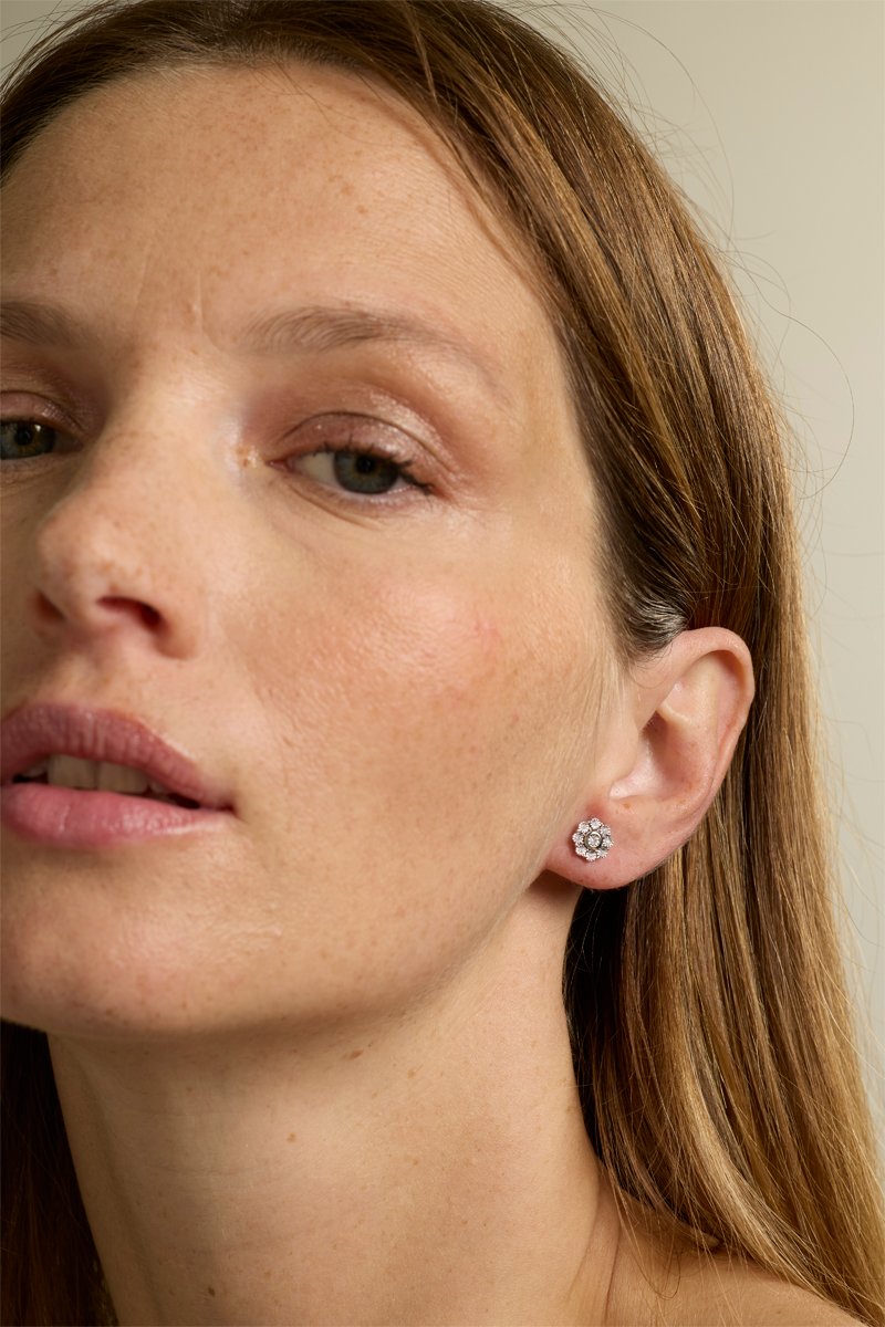 Puces en or blanc serties de 9 diamants.