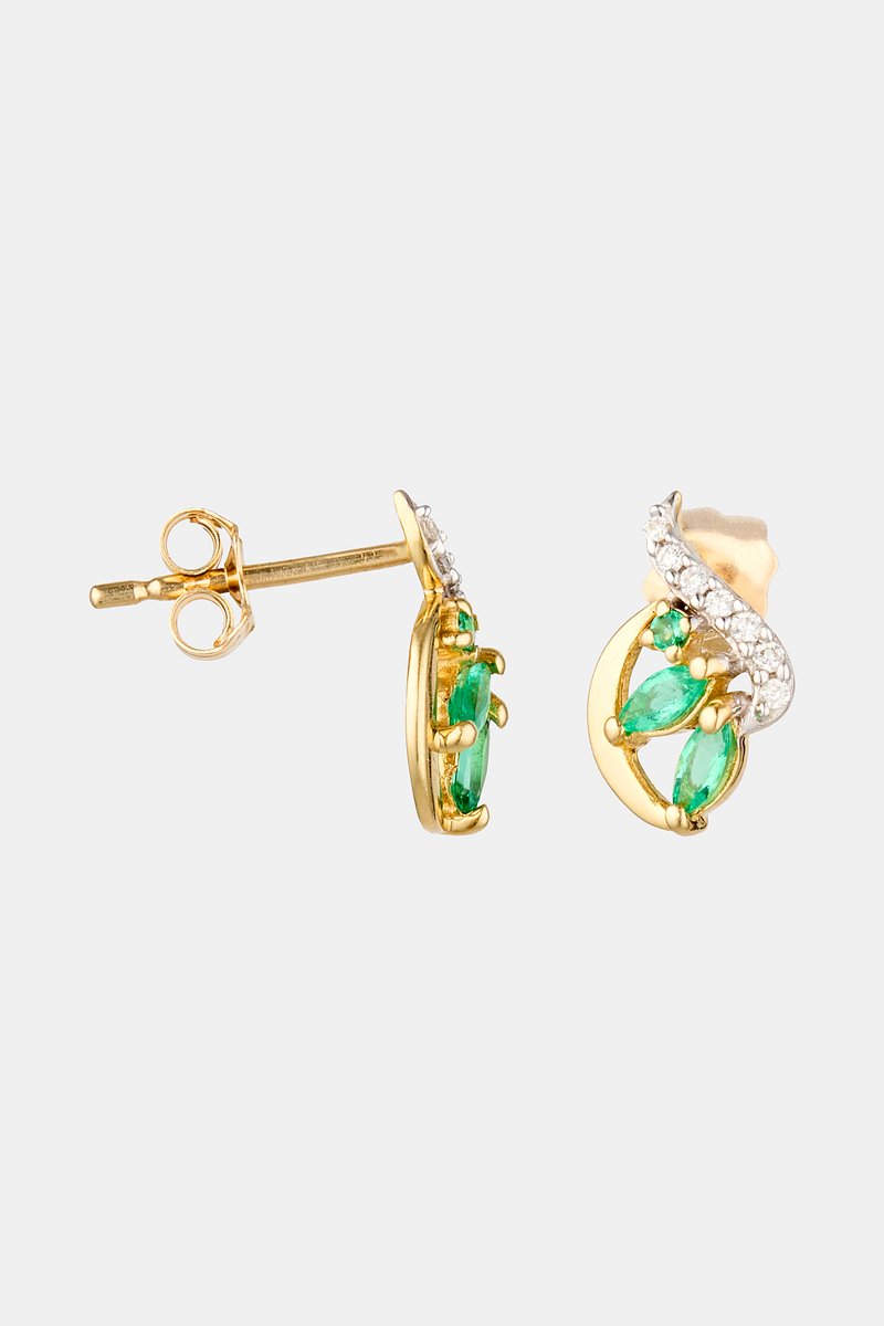 Puces en or jaune serties de 3 émeraudes et de 7 diamants.