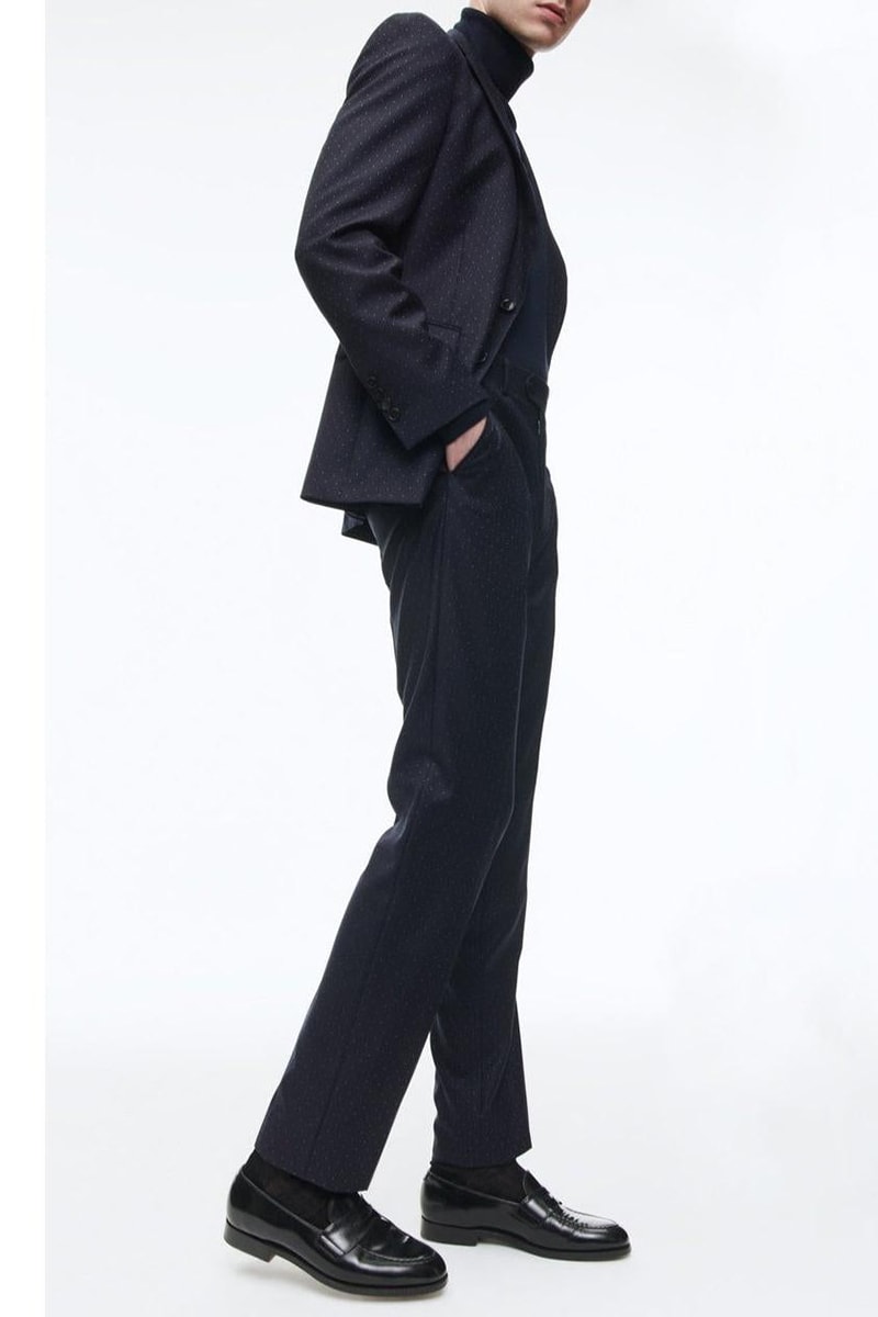 Costume à la coupe ajustée, confectionné en laine vierge, il arbore un motif plumetis élégant sur fond bleu marine.