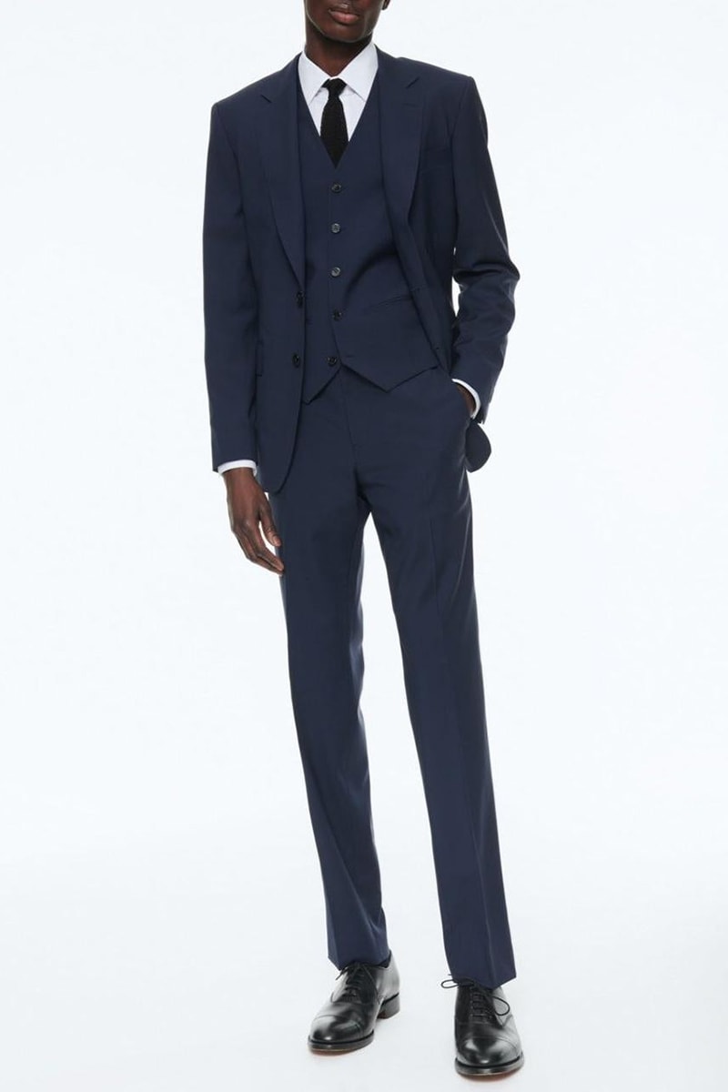 Costume 3 pièces en laine vierge aux lignes professionnelles et à la coupe ajustée, il présente une emmanchure haute et une épaule droite pour un style élégant.