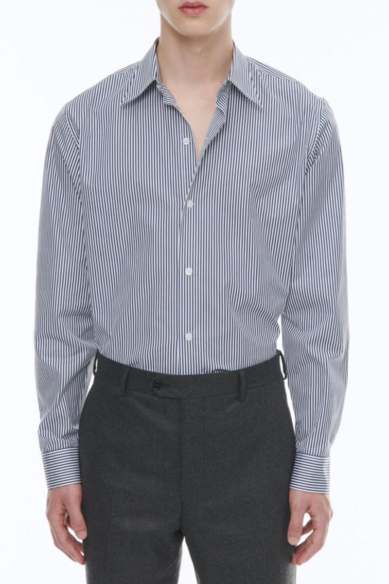 Chemise à rayures dans les tons bleu marine, avec un col hirondelle et une coupe ajustée pour un look sophistiqué.