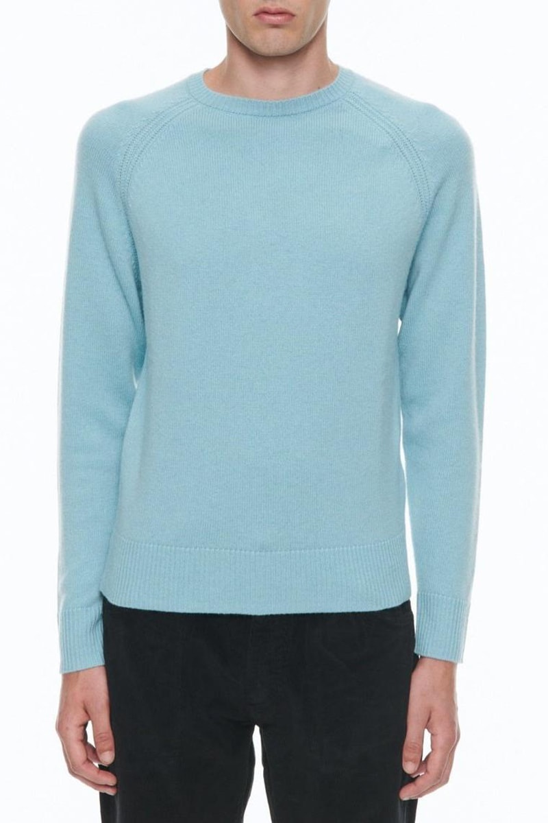 Coupe moderne avec manches raglan, ce pull en laine et cachemire bleu ciel se distingue par sa maille fine et son élégance intemporelle.