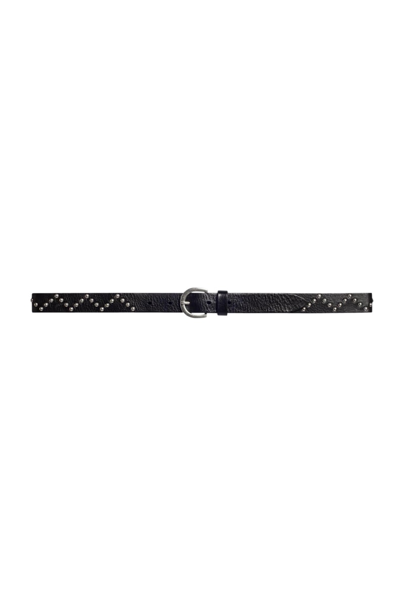 Élégante ceinture à clous en cuir de vachette noir, ornée de clous en zig-zag pour une touche distinctive.