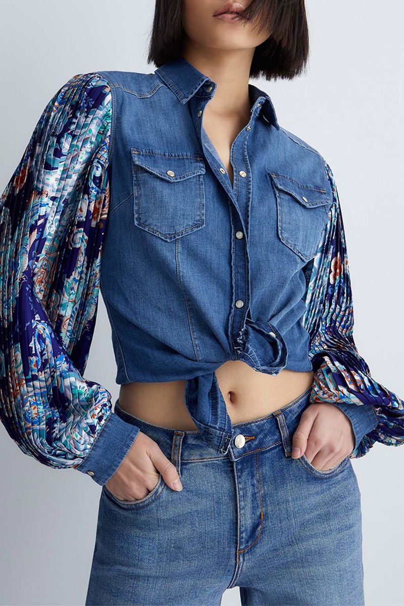 Chemisier noué à manches longues boutonnées et bouffantes.