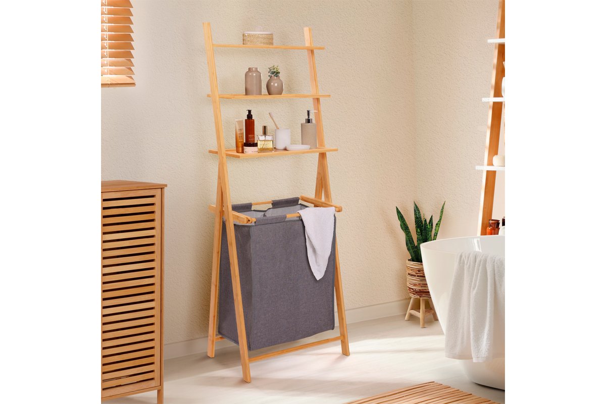 Panier à linge avec étagère en bambou Maya - Gris et naturel