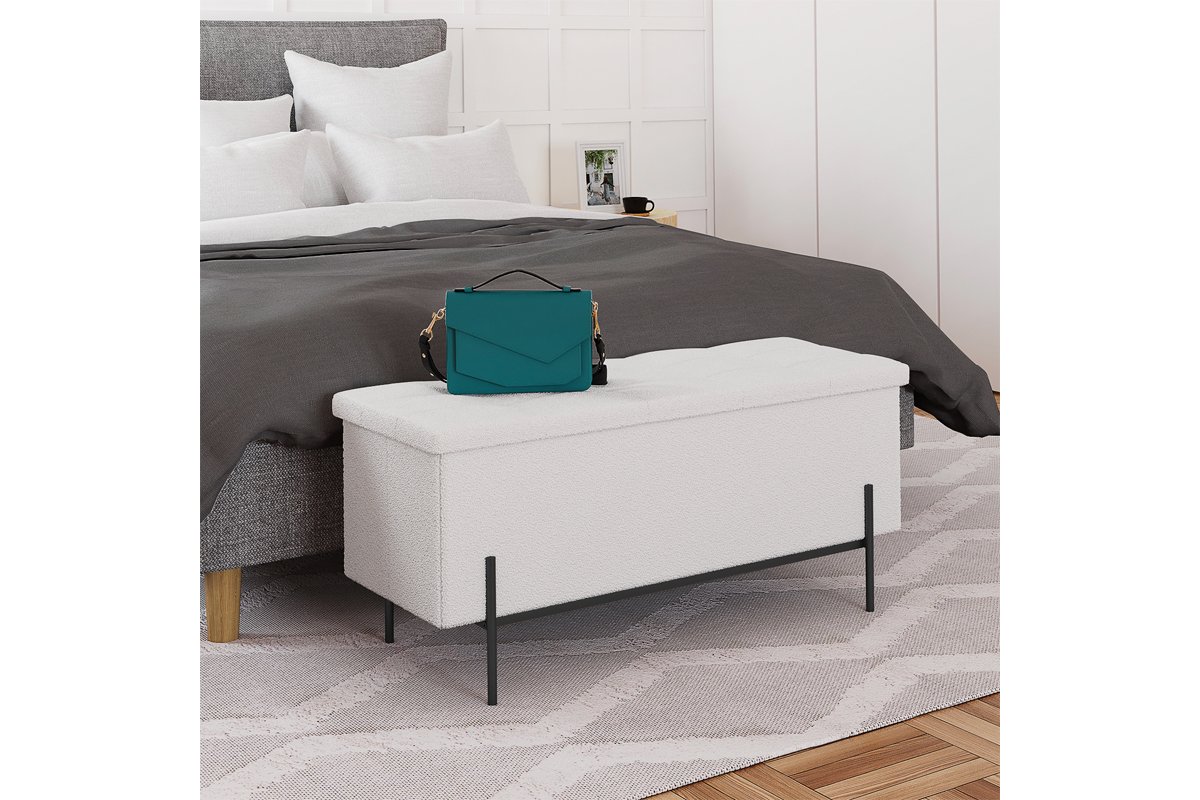 Banc-coffre Loan - Blanc et noir - Tissu bouclette