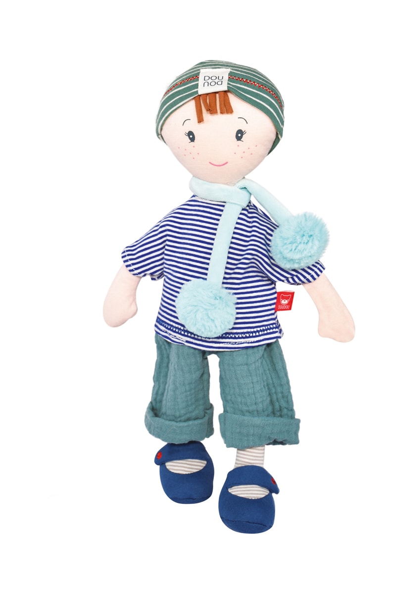 Vêtu d’une marinière : bonnet, écharpe avec pompons, t-shirt à motifs à rayures, pantalon et chaussons.