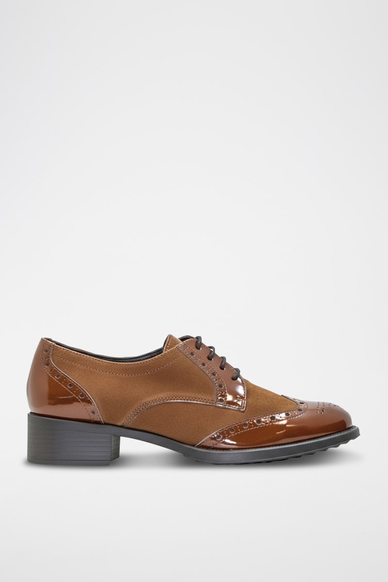 Derbys à talons en cuir verni et nubuck.