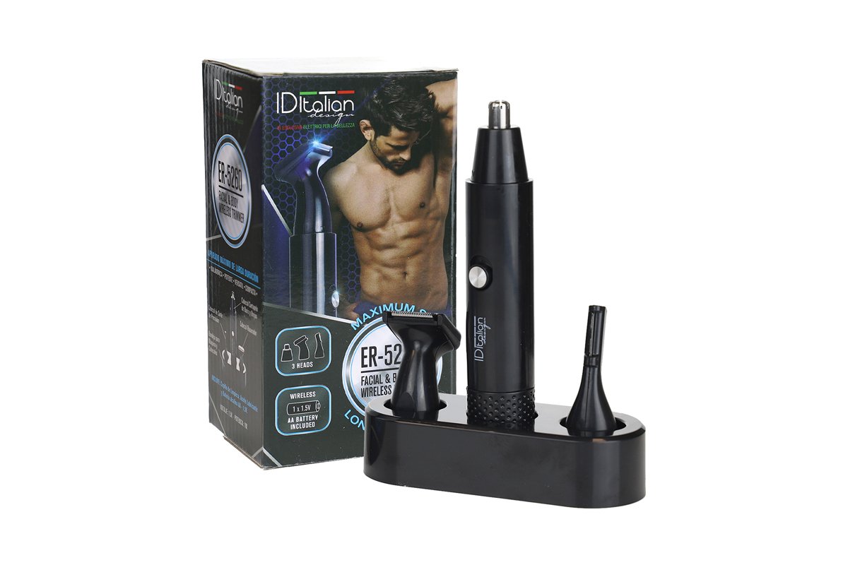 Rase et coupe les poils sur de grandes surfaces du corps, comme le nez, les oreilles, la poitrine, les bras, le dos.