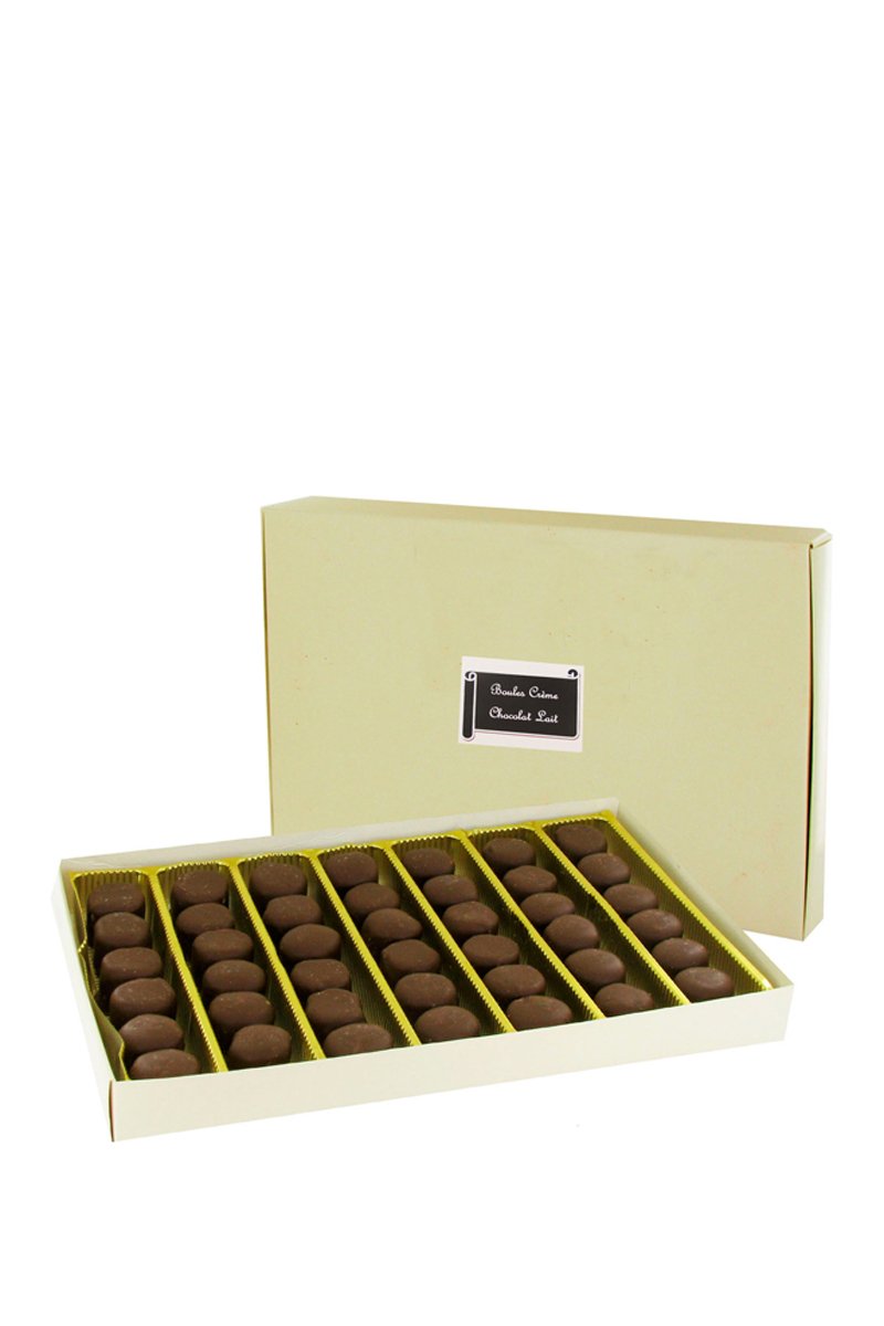 Ingrédients : chocolat lait 39% de cacao, sucre, beurre de cacao, pâte de cacao, lait en poudre, glucose, vanilline, émulsifiant : lécithine de soja sans OGM, sorbitol, arôme naturel de vanille. Pur beurre de cacao.