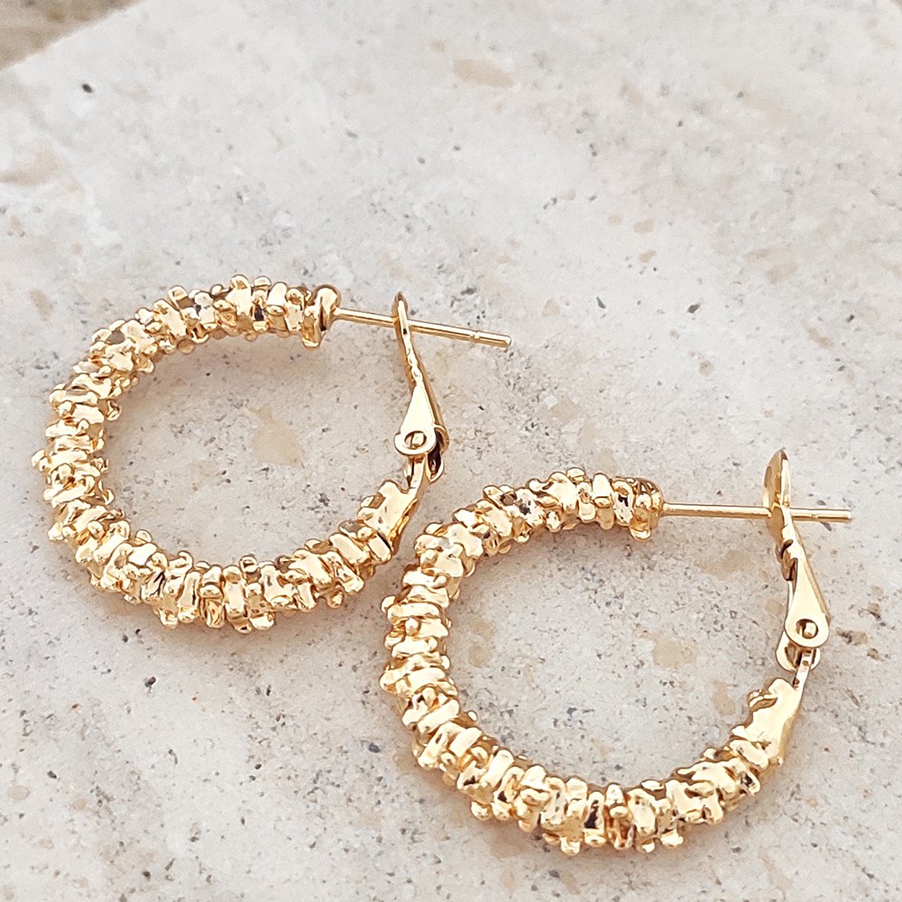 Craquez pour ces créoles en laiton plaqué or, au motif délicatement travaillé ! Elles ajoutent une touche sophistiquée à votre tenue.