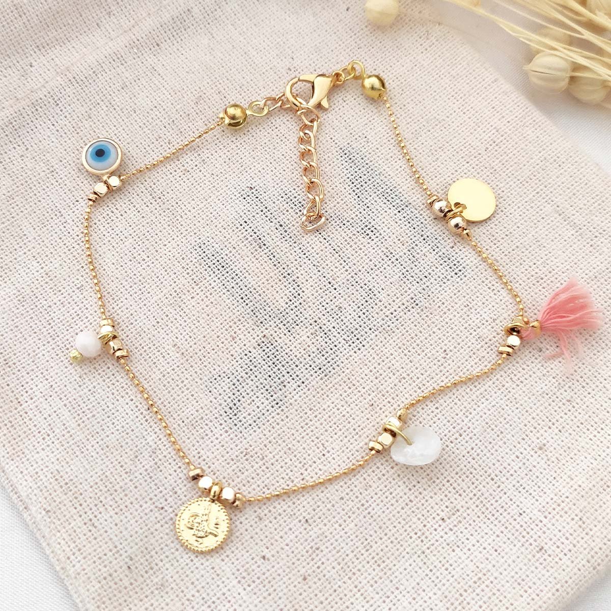Bracelet de cheville avec perles œil & pièces de monnaie ancienne - Laiton plaqué or