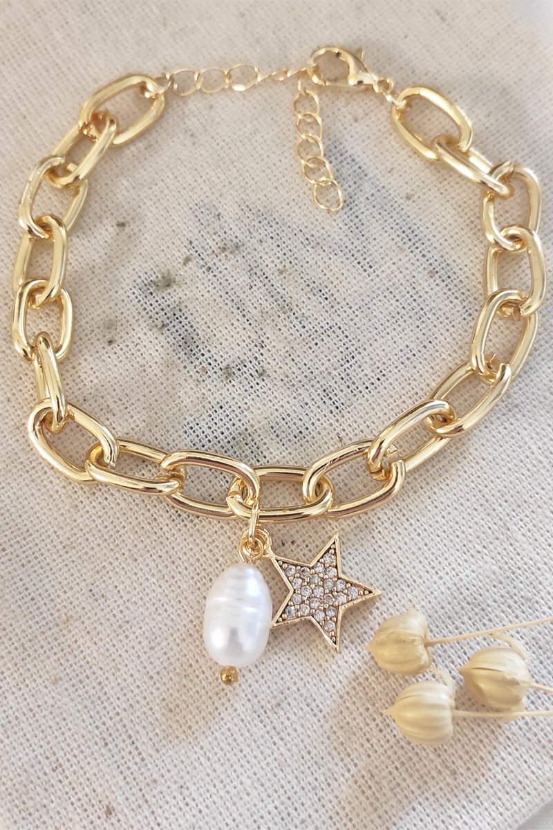 Bracelet en plaqué or jaune serti de nacre et zircons.