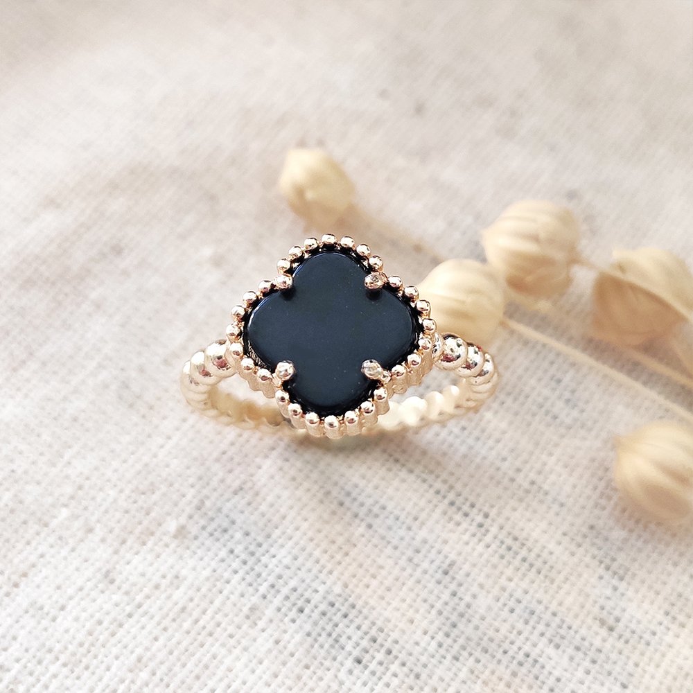 Embellissez vos doigts avec cette bague réglable. La pierre nacrée noire en forme de trèfle apporte une élégance mystérieuse à votre look.