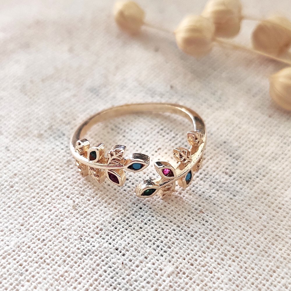 Sublimez vos doigts avec cette bague réglable en laiton plaqué or. Les zircons colorés apportent une touche d'éclat, tandis que le motif feuille évoque la nature.