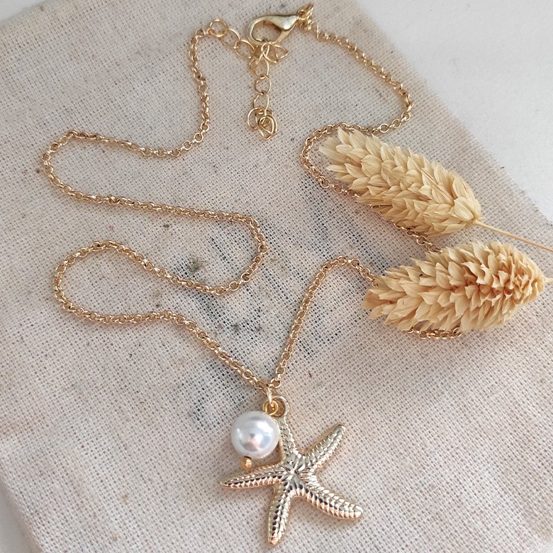 Collier pendentif en étoile de mer - Laiton doré, plaqué or & perle