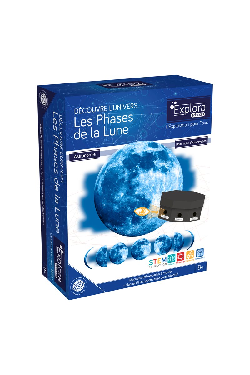 Contenu de la boite : 11 formes différentes de cartonnettes pour construire le boitier lunaire, 1 boule de mousse et 1 étiquette phase de lune.