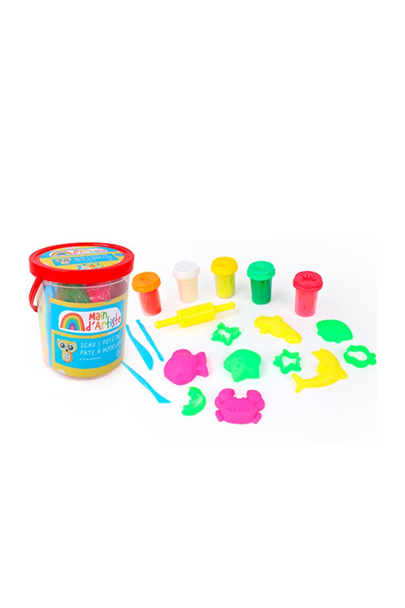 Seau avec 5 pots de pâte à modeler de 65 g avec 12 accessoires.