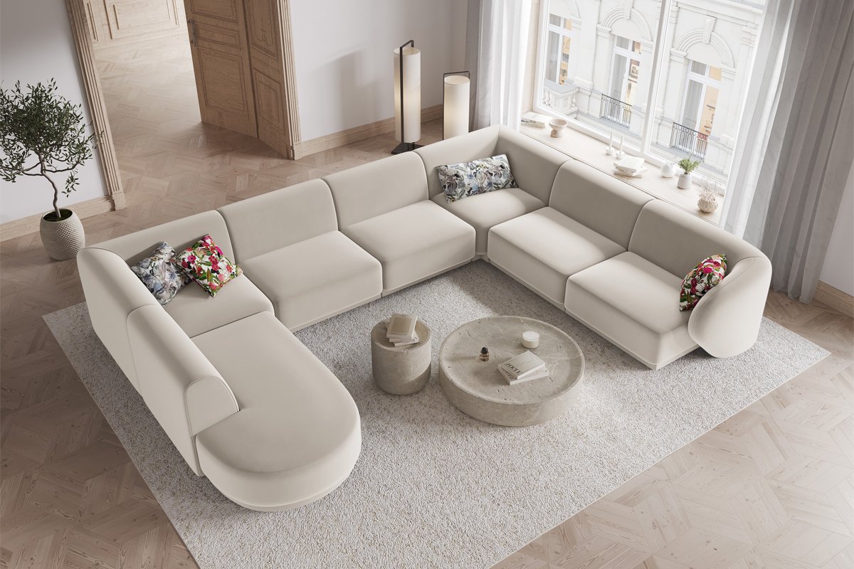 Canapé d'angle droit panoramique Lionel - Beige - 8 places - Revêtement en velours