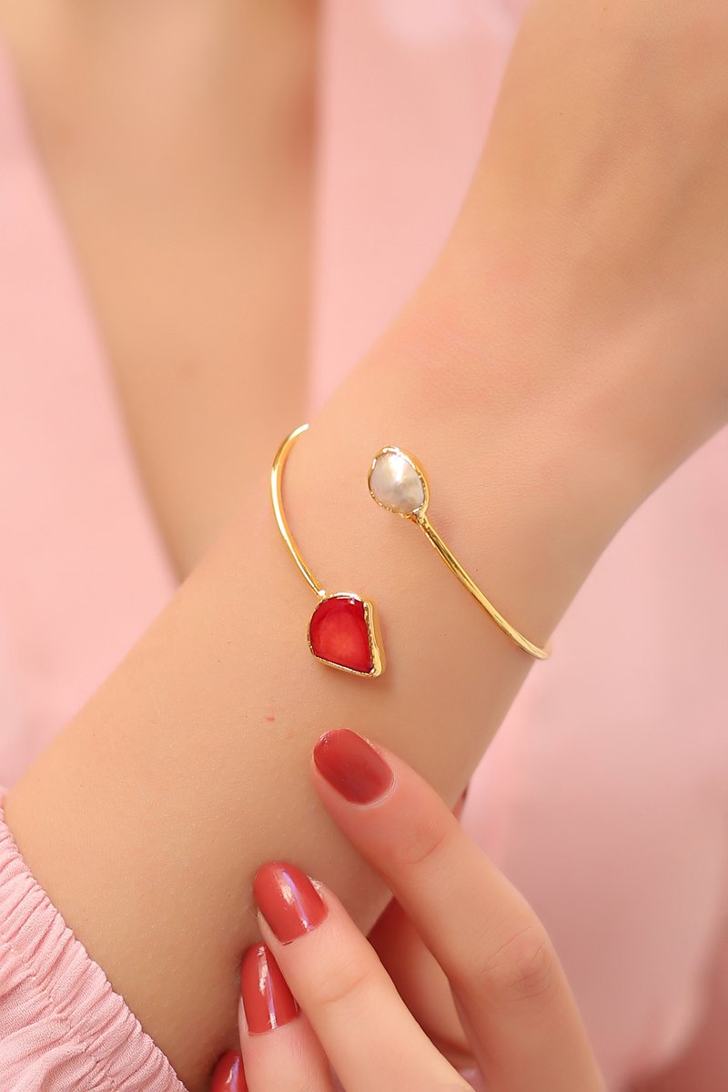 Jonc ouvert en bronze serti d'une perle de culture et de corail.