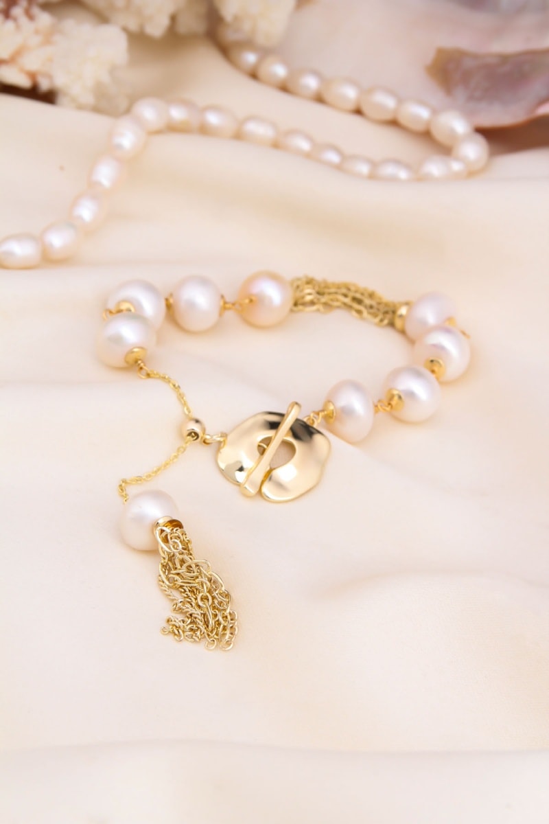 Bracelet en plaqué or jaune serti de 9 perles de culture.