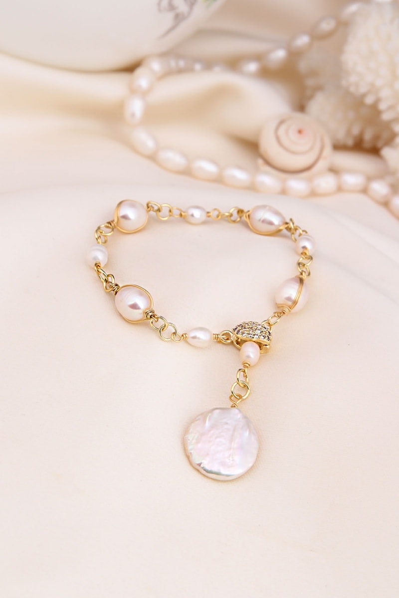 Bracelet - Plaqué or jaune, perles de culture et zircons