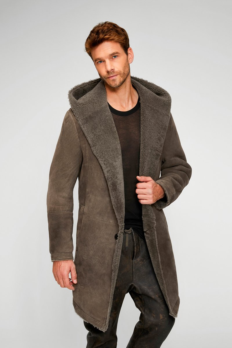 Manteau à capuche en cuir de mouton nubuck.