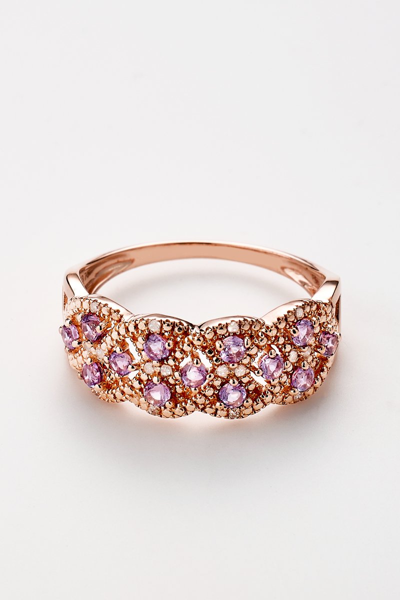 Bague en or rose serti de 16 diamants, de 5 améthystes et de 30 quartz rose.