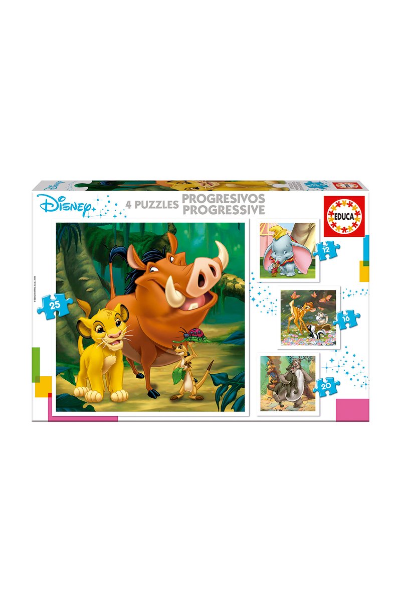 4 puzzles progressifs Le Roi Lion, Le Livre de la Jungle, Bambi et Dumbo Disney comprenant :