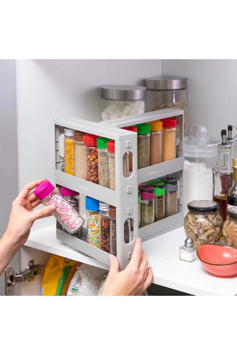 Pivotant et coulissant, conçu sur deux étages, l'organisateur d'épices a une capacité de 20 pots.