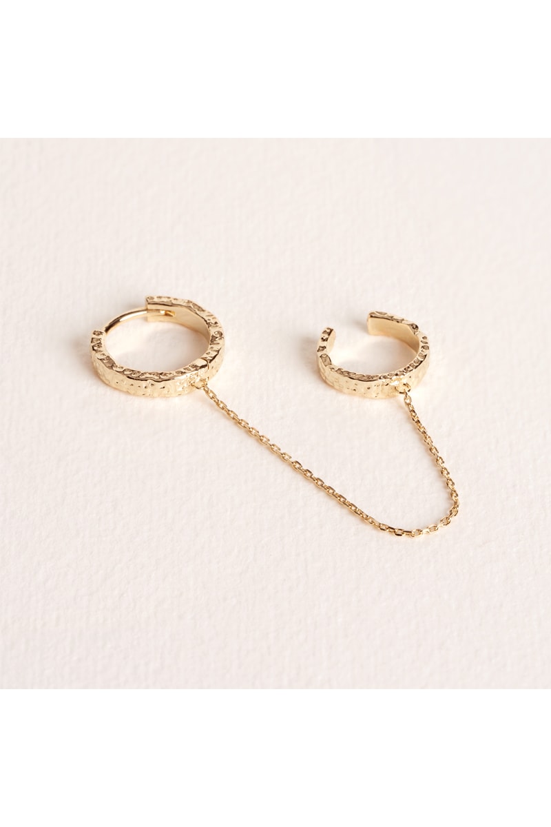 2 earcuffs en plaqué or jaune reliés par chaînette.
