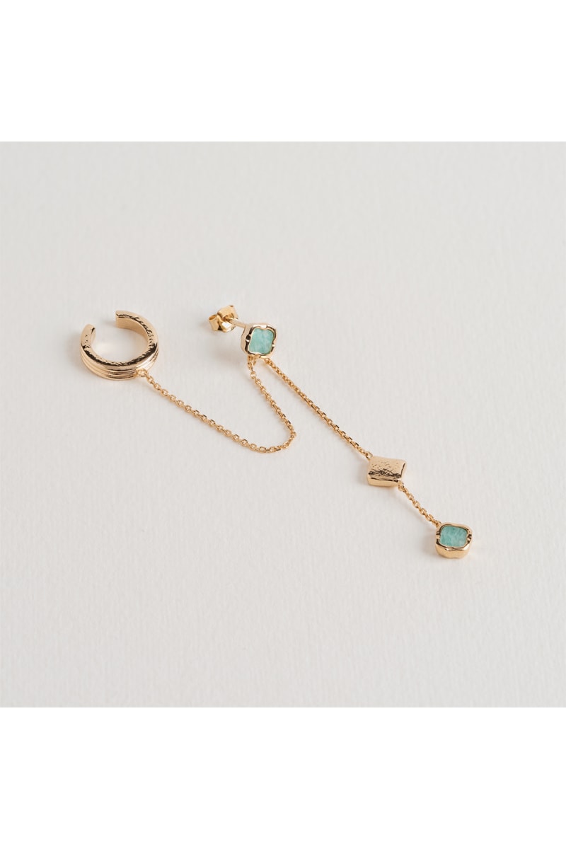 2 earcuffs en plaqué or jaune reliés par chaînette sertis de 2 amazonites.