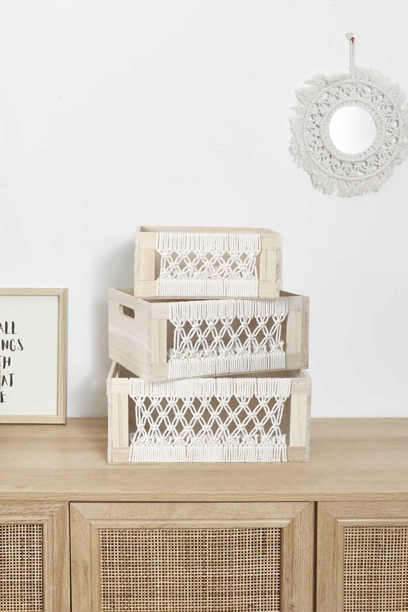 3 paniers de rangement en bois de paulownia Gigogne Boho - Beige et blanc