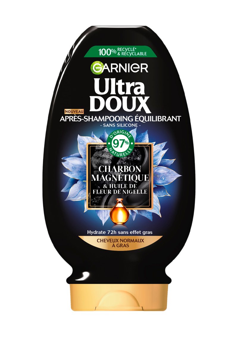 Garnier Ultra Doux associe le pouvoir du charbon purifiant et de l'huile de fleur de nigelle hydratante dans un remède équilibrant pour hydrater les cheveux sans effet gras.